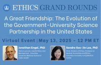 Our community of scholars has attempted to nurture an academic culture that embraces the importance of diversity, supports the mentorship of young scholars, cultivates the value of interdisciplinarity, exemplifies intellectual and ethical integrity, and respects differences of opinion and perspective. With that academic culture in mind, the organizers and hosts of Ethics Grand Rounds are committed to providing a safe and productive meeting environment that fosters open dialogue and the exchange of scientific ideas, promotes equal opportunities and treatment for all participants, and is free of harassment and discrimination. All participants are expected to treat others with respect and consideration, follow venue rules, and alert organizers, staff or security of any dangerous situations or anyone in distress. Speakers are expected to uphold standards of scientific integrity and professional ethics. The Ethics Grand Rounds organizers recognize that there are areas of science that are controversial. Ethics Grand Rounds can serve as an effective forum to consider and debate science-relevant viewpoints in an orderly, respectful, and fair manner. These considerations apply to all attendees, speakers, staff, and guests at Ethics Round Rounds and apply in both in-person and virtual contexts.
